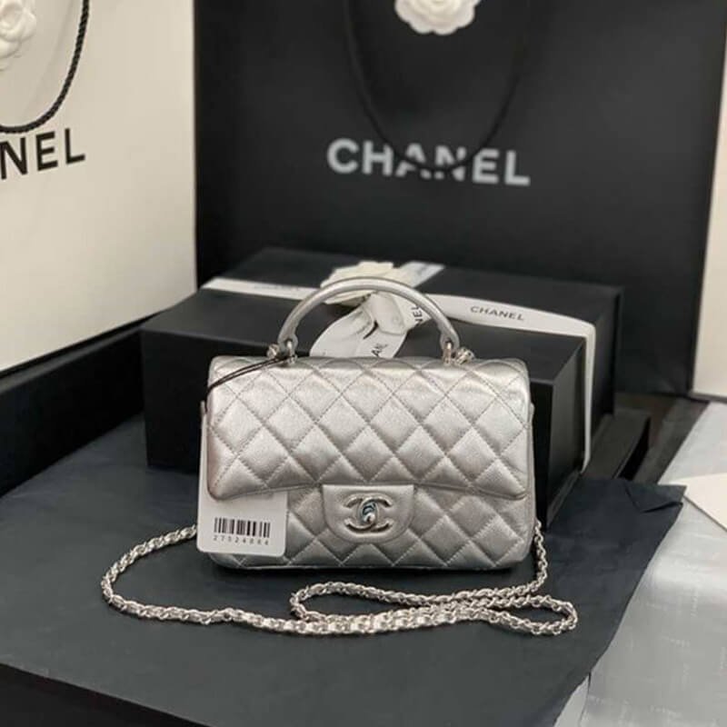 The CHANEL Mini Flap Bag is an iconic, timeless luxury accessory from Chanel’s legendary collection, blending exquisite French craftsmanship with modern everyday elegance. Expertly crafted in premium silver metallic quilted calfskin, this compact handbag features the signature diamond-quilted pattern, iconic CC turn-lock, silver-tone metal hardware, an adjustable interwoven leather chain strap, and a top handle, making it perfect for daily commuting, evening outings, and stylish everyday use.