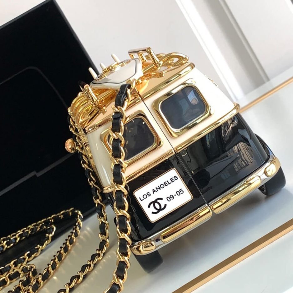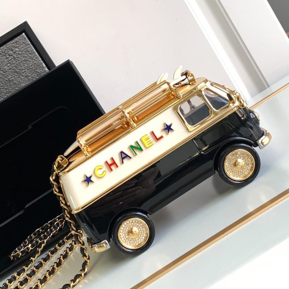 The CHANEL MINI VAN MINAUDIERE is an ultra-rare, limited-edition luxury accessory from Chanel’s 24C Cruise Collection, a true collector’s piece blending exquisite French craftsmanship with playful, iconic design. Crafted from polished resin and metal, this whimsical van-shaped minaudière features the signature CHANEL logo, detailed wheels, and an adjustable interwoven leather chain strap, making it the ultimate statement piece for evening events, red carpets, and luxury collections.