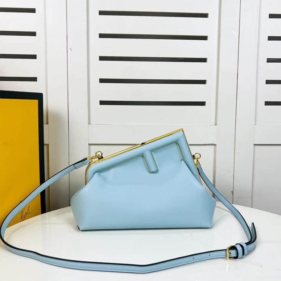 The Fendi First Small is an iconic, timeless luxury accessory from Fendi’s legendary collection, blending Italian craftsmanship with modern everyday versatility. Expertly crafted from premium smooth leather in a soft light blue finish, this structured small bag features the signature oversized F metal clasp, distinctive asymmetrical silhouette, and a detachable adjustable shoulder strap, making it perfect for daily commuting, casual outings, and stylish everyday use.
