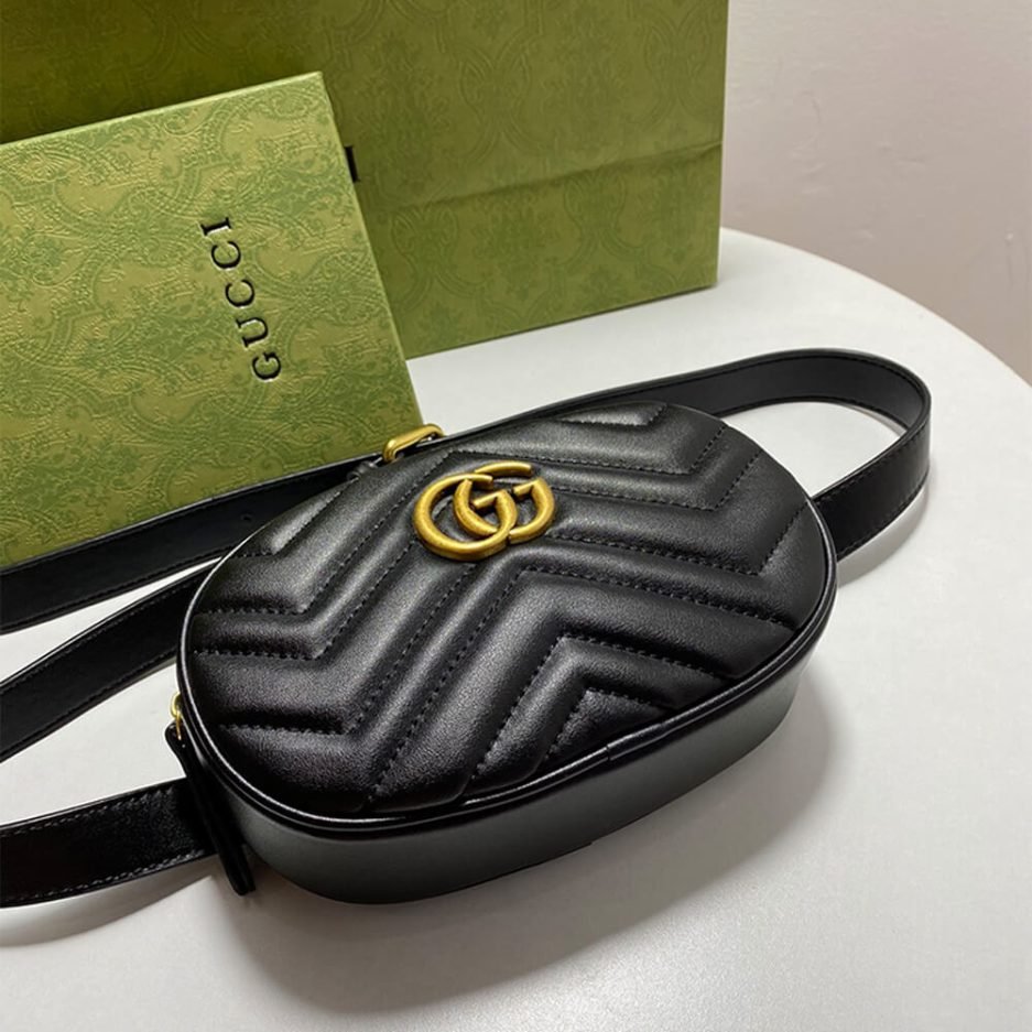 The GG Marmont Quilted Leather Belt Bag is an iconic, versatile essential from Gucci’s legendary Marmont collection, blending Italian luxury with modern everyday practicality. Crafted from premium black calfskin leather with the signature chevron quilting, this structured belt bag features a polished gold-tone Double G hardware, an adjustable leather belt strap, and a secure zip closure. Its compact yet functional interior offers ample space for daily essentials, making it perfect for hands-free carry, casual outings, travel, and stylish everyday use.