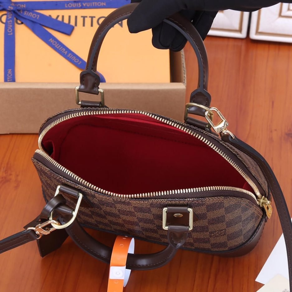 The Louis Vuitton ALMA BB is an iconic, structured dome-shaped handbag with refined top handles and a detachable leather strap, offering versatile carry options for hand-held, shoulder or crossbody wear. It features a classic silhouette with a secure lock closure, combining the iconic Damier Ebene canvas with smooth leather trims, embodying timeless elegance and practical daily functionality.