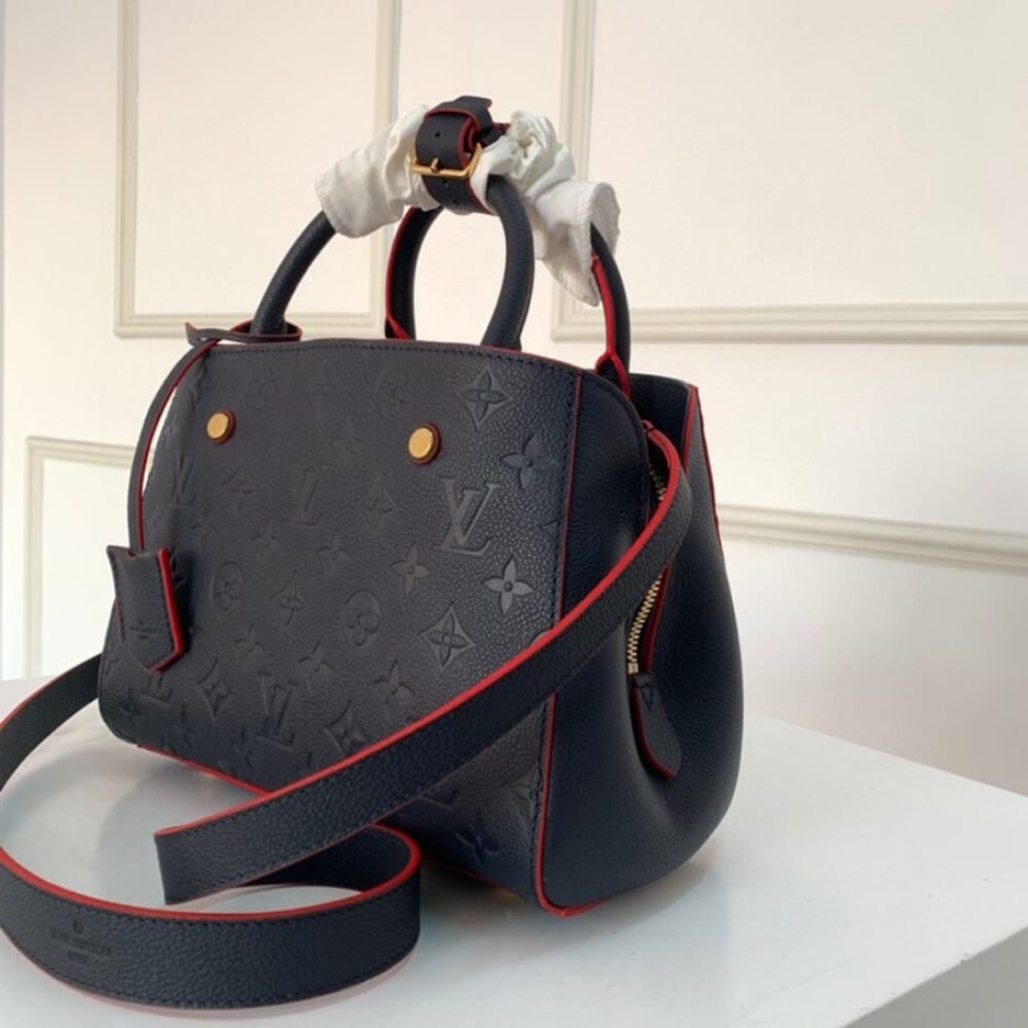 The Louis Vuitton Montaigne BB is a structured, compact handbag with refined top handles and a detachable leather strap, offering versatile carry options for hand-held, shoulder or crossbody wear. It features a sleek silhouette with a secure flap closure, combining the iconic monogram empreinte leather with subtle red edge accents and practical daily functionality.