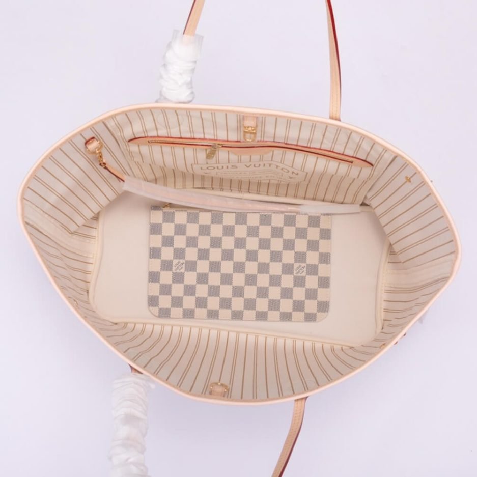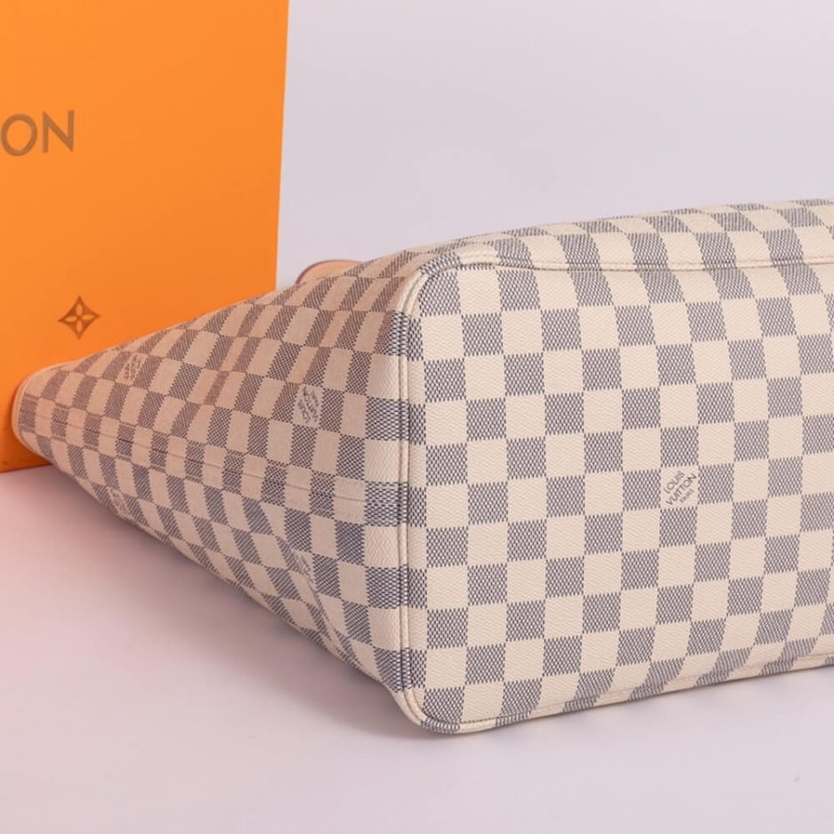 The Louis Vuitton NEVERFULL GM is an iconic and spacious tote bag, featuring the signature Damier Azur checkered canvas exterior and a natural beige interior lining. It comes with two sturdy top handles for comfortable shoulder carry, and adjustable side laces that allow you to modify the bag’s silhouette—cinching for a more structured look or loosening for a relaxed, open shape. The open-top design offers easy access to your belongings, while the durable canvas construction ensures long-lasting wear, making it perfect for daily use or travel.