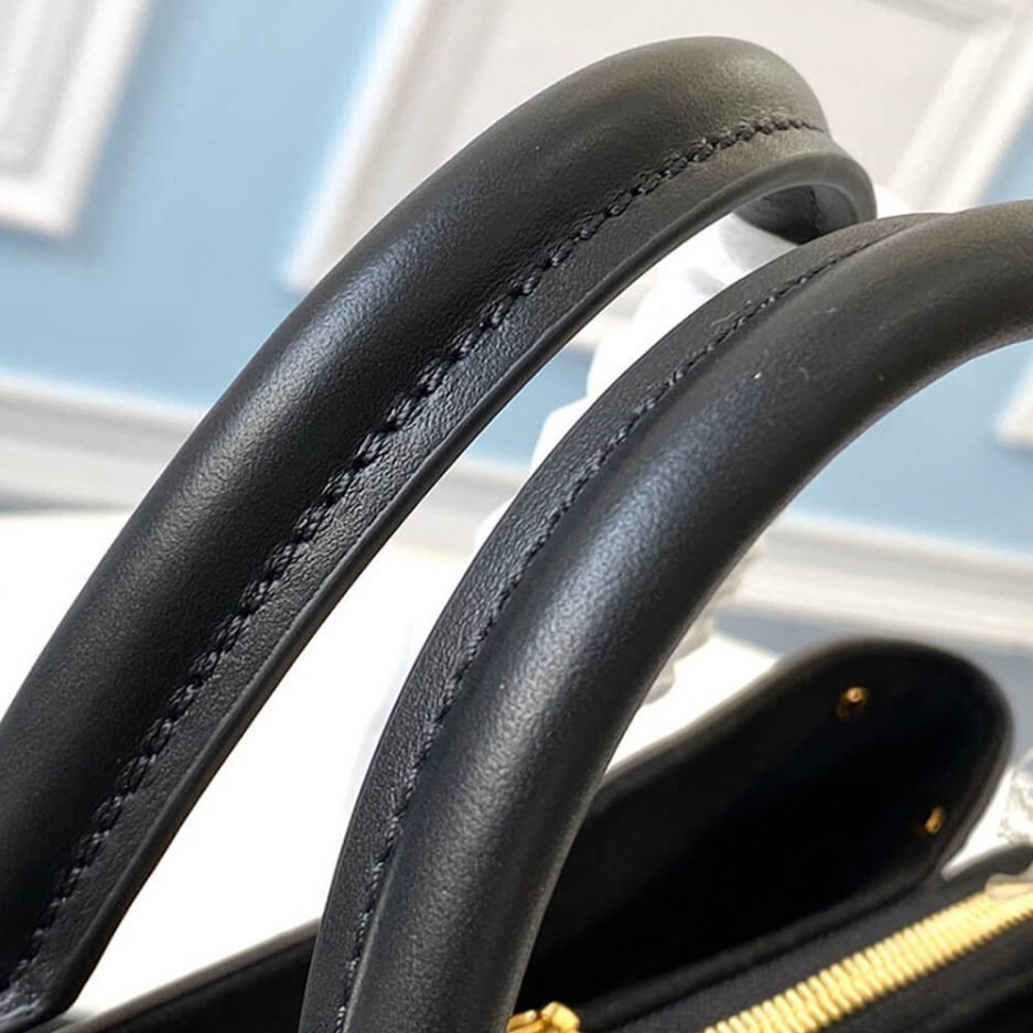 The Louis Vuitton SOUFFLOT BB is a compact, structured handbag crafted from iconic Monogram coated canvas with sleek black leather trim. It features polished gold-tone hardware, dual top handles, and a detachable, adjustable shoulder strap for versatile shoulder, crossbody, or hand carry. The organized interior offers ample space for daily essentials, blending timeless LV heritage with modern practicality.