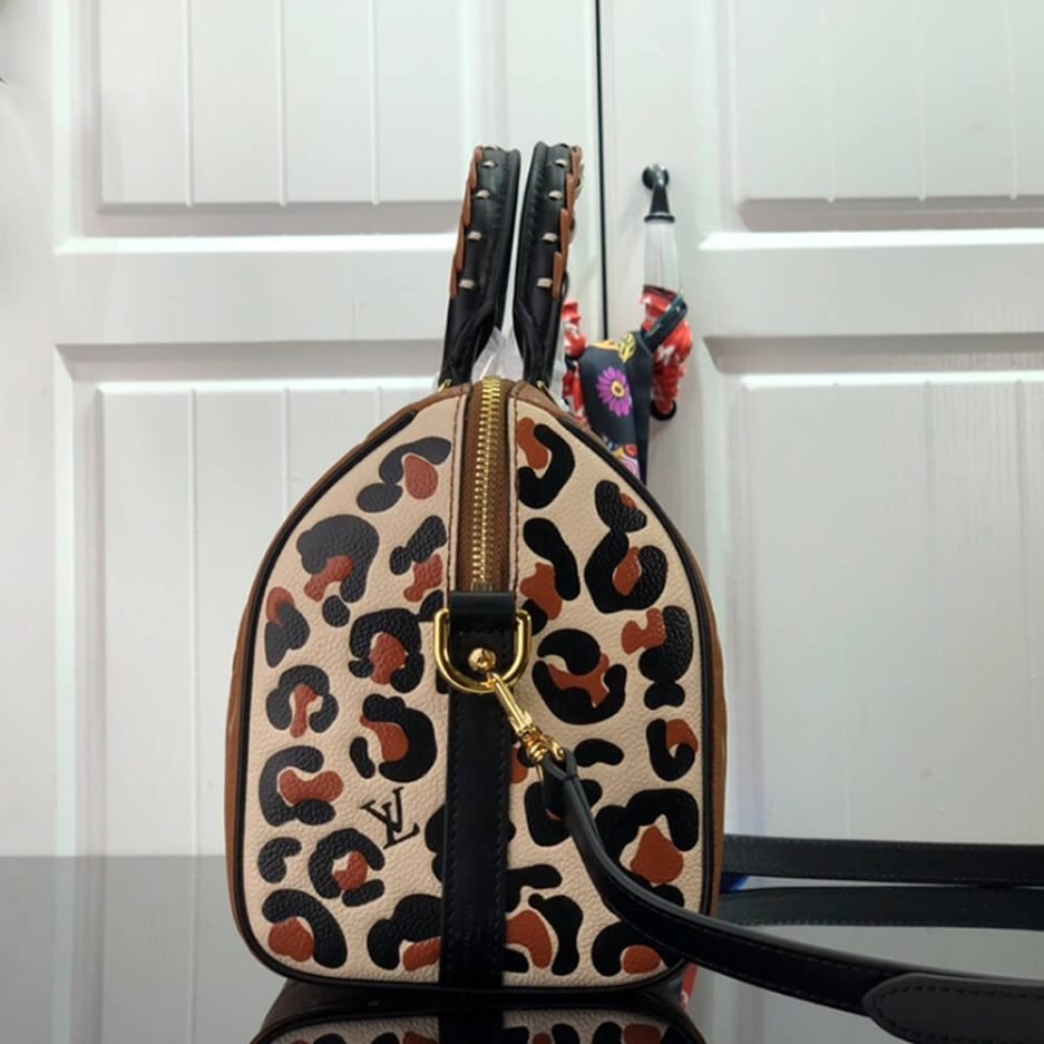 The Louis Vuitton SPEEDY BANDOULIERE 25 is a timeless and compact handbag, crafted from warm tan embossed Monogram leather with striking leopard-print leather trim along the side panels and handle edges. It features the iconic cylindrical silhouette with sturdy top handles adorned with matching leopard-print detailing, a polished gold-tone lock closure for security, and a detachable, adjustable shoulder strap that transforms it into a versatile crossbody or shoulder bag. The structured yet soft shape offers organized storage for daily essentials, while the embossed leather finish and wild side trim add a bold, modern edge to the brand’s classic heritage.