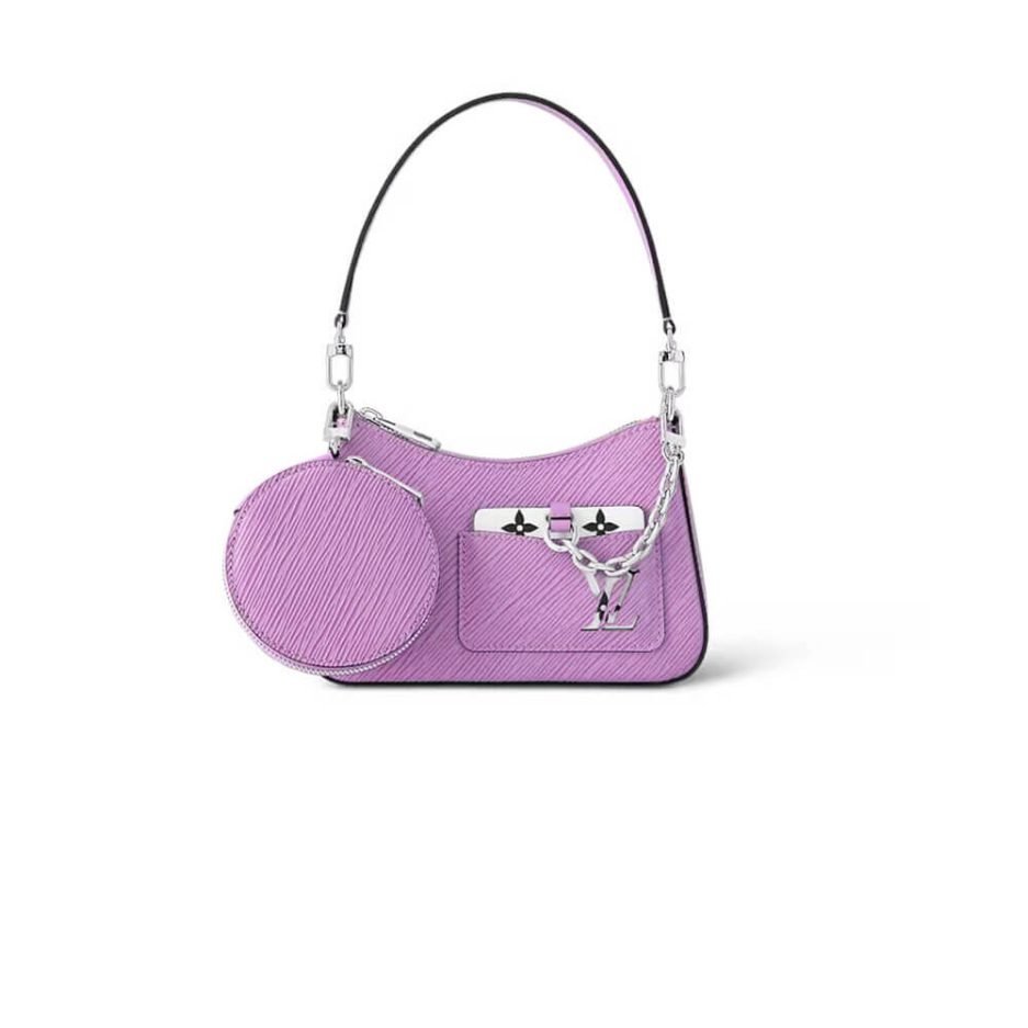 The Louis Vuitton Marellini bag reimagines the iconic Marelle silhouette in a charming mini hobo format, finished in a stunning lilac purple hue. This playful yet sophisticated piece features a detachable round zip coin purse, a front flat pocket with a small mirror secured by a polished silver-finish chain, and a smooth top handle for effortless shoulder carry. With a zip closure, interior flat pocket, and silvery metal hardware, this versatile Marellini delivers the perfect blend of sporty-chic style and everyday functionality, ideal for elevating any casual or dressed-up look.