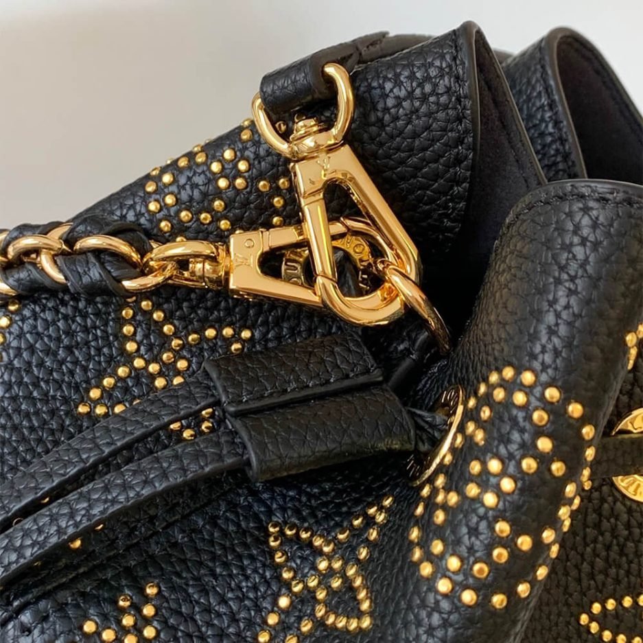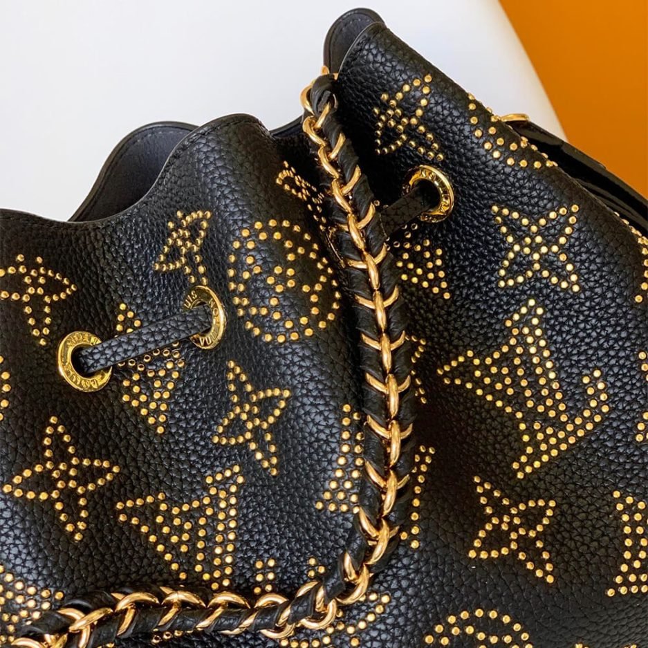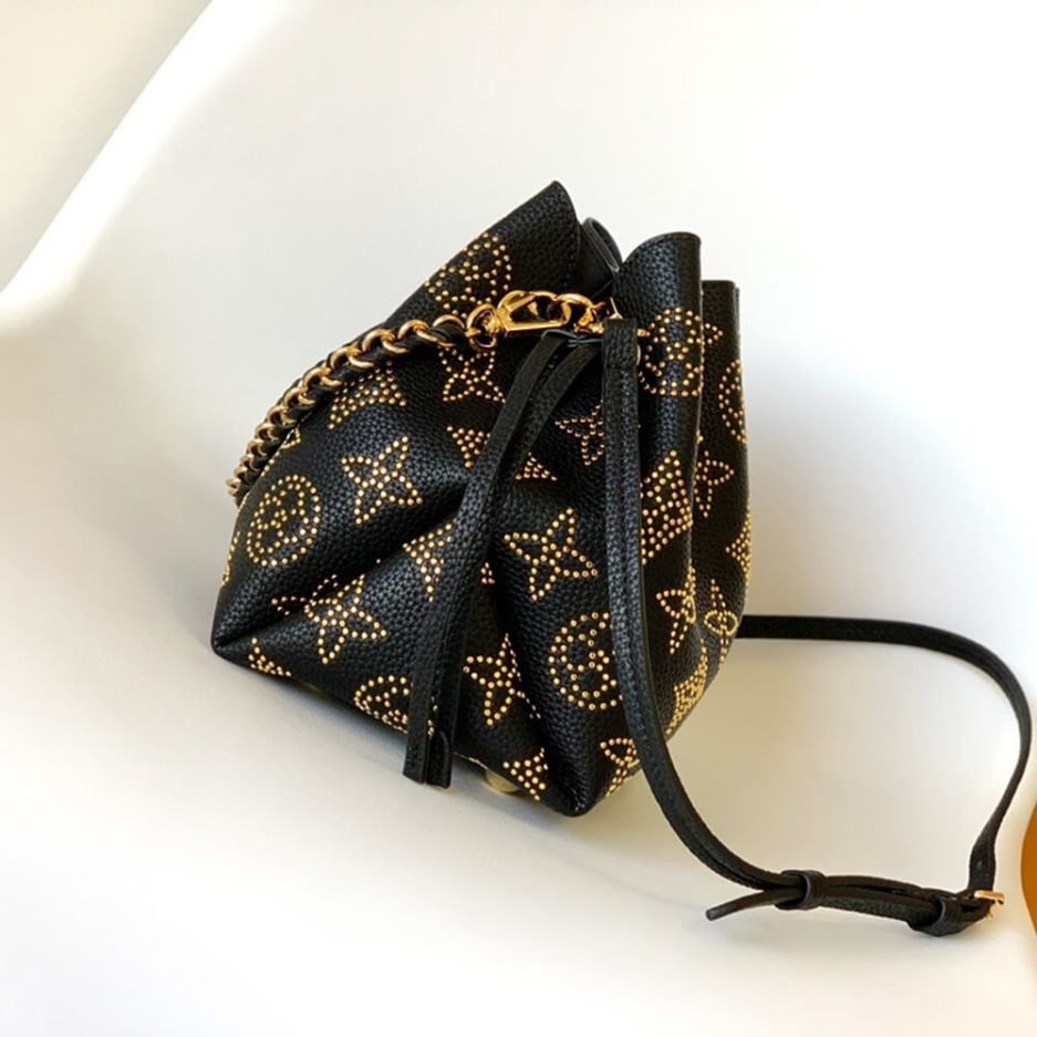 The Louis Vuitton Bella Bucket Bag is a chic, versatile drawstring bucket bag crafted in a sleek black silhouette, elevated by polished gold-tone chain hardware and a detachable round pouch. This stylish piece features an adjustable drawstring closure for security, a removable chain strap for crossbody or shoulder carry, dual top handles for hand carry, and a spacious interior with multiple compartments to organize daily essentials. With its modern, feminine design and iconic House details, this bag delivers the perfect blend of timeless elegance and everyday functionality, ideal for elevating any casual or professional look.