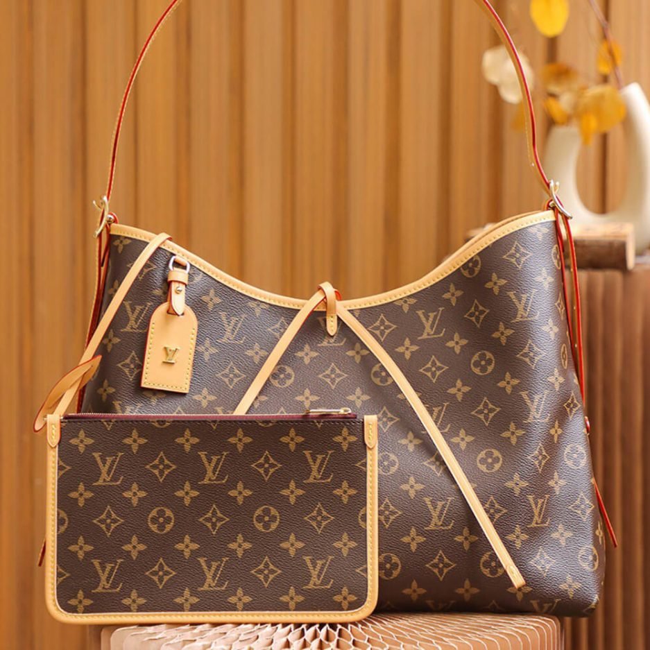 The Louis Vuitton CarryAll MM is a chic, spacious everyday tote bag crafted with the House’s iconic Monogram canvas and natural leather trim. This versatile piece features dual top handles for effortless hand carry, a relaxed yet structured silhouette that conforms to its contents, and a roomy interior designed to hold daily essentials such as a wallet, phone, cosmetics, and a small tablet. With its timeless design and practical functionality, this CarryAll MM delivers the perfect blend of Parisian elegance and everyday usability, making it an ideal companion for both work and weekend outings.