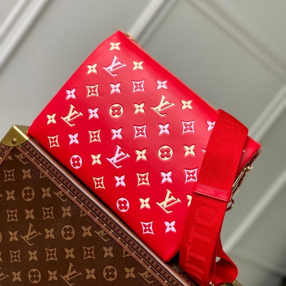 LV Coussin PM 手袋是 2021 春夏系列的一大亮点,其柔软如枕的轮廓令人眼前一亮。这款手袋配有可拆卸的粗链条和可调节肩带,提供多种背法——斜挎、单肩或腋下挎皆可。内部设有多个隔层和一个拉链口袋,兼具实用性和时尚前卫的魅力,是打造现代都市造型的完美配饰。
