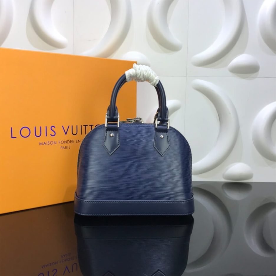 The LV NEO ALMA BB is an iconic, structured dome-shaped handbag with refined top handles and a detachable leather strap, offering versatile carry options for hand-held, shoulder or crossbody wear. It features a modern silhouette with a secure double-zip closure, combining deep navy Epi leather with sleek silver-tone hardware, embodying sophisticated elegance and practical daily functionality.
