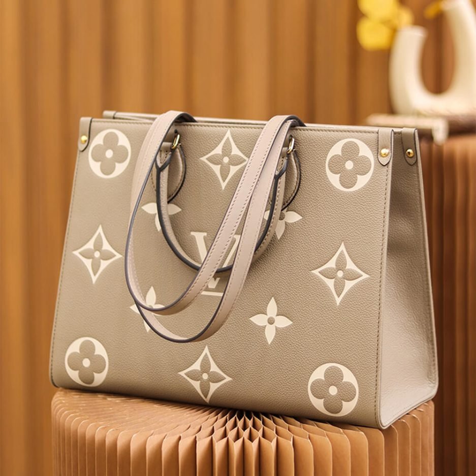 The LV ONTHEGO MM is a structured and spacious tote bag, crafted from light beige embossed Monogram leather with a refined, textured finish. It features a rigid rectangular silhouette with sturdy top handles, protective metal feet at the base to preserve its shape, and a detachable, adjustable shoulder strap that offers versatile wearing options. The open-top design provides ample space for work essentials, a laptop, or daily belongings, while the embossed leather finish elevates the brand’s classic monogram heritage, blending understated luxury with modern practicality.