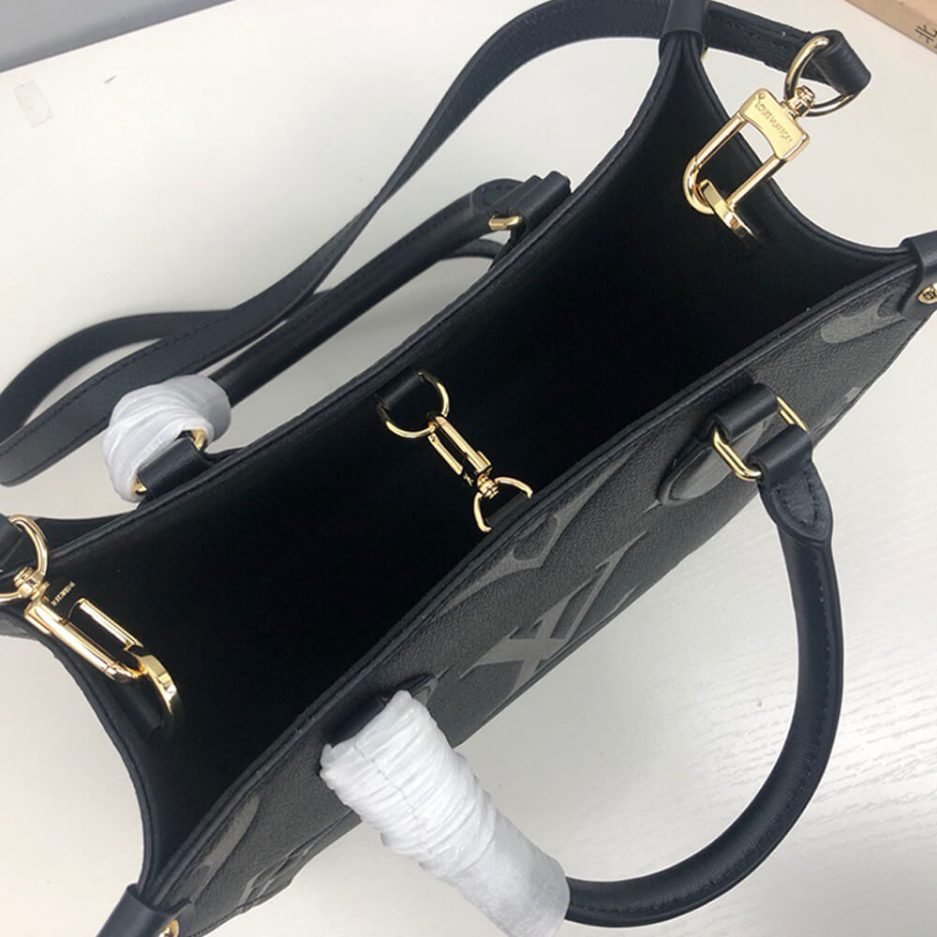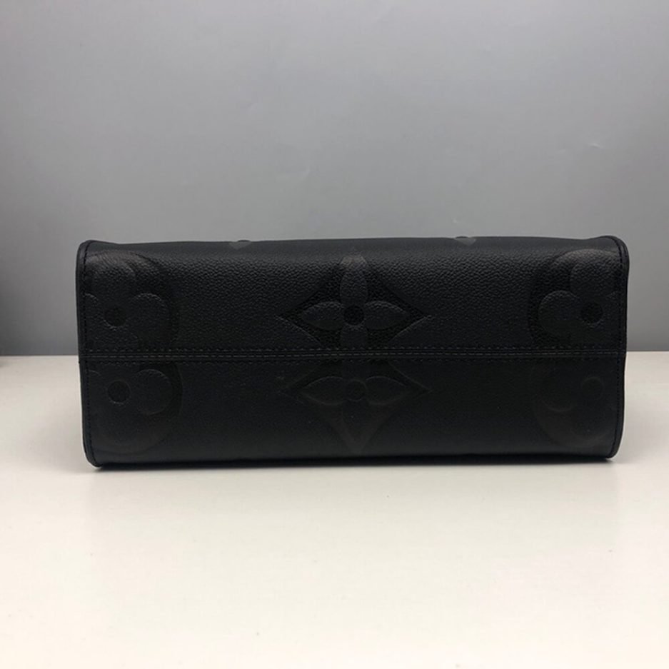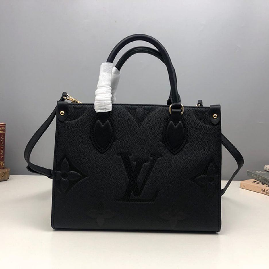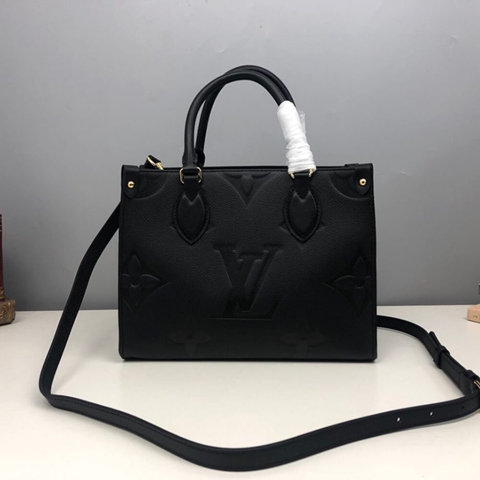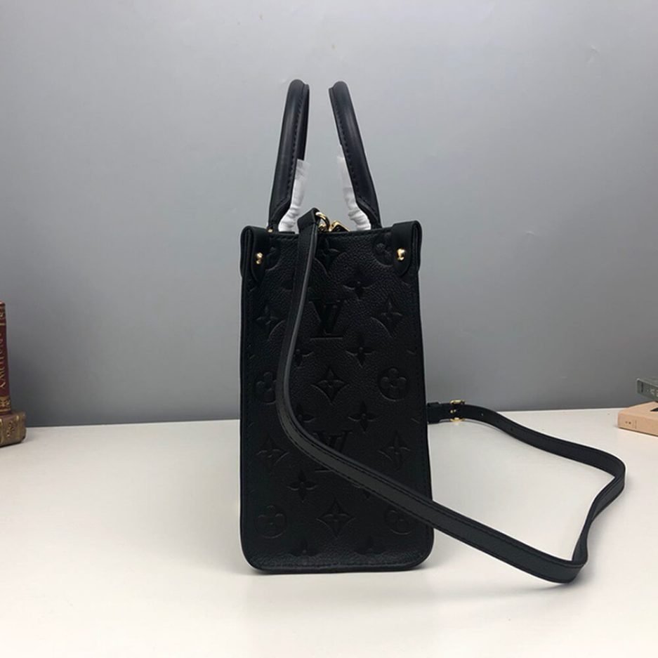The LV ONTHEGO PM is a structured and versatile tote bag, crafted from black embossed Monogram leather with a refined, textured finish. It features a rigid rectangular silhouette with sturdy top handles, protective metal feet at the base to preserve its shape, and a detachable, adjustable shoulder strap that transforms it into a comfortable crossbody bag. The open-top design offers generous storage for work essentials, a laptop, or daily belongings, while the embossed leather finish elevates the brand’s classic monogram heritage, blending understated luxury with modern practicality.