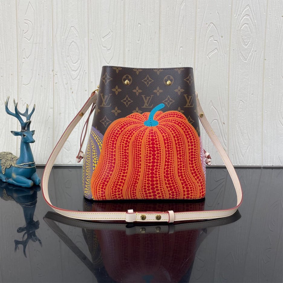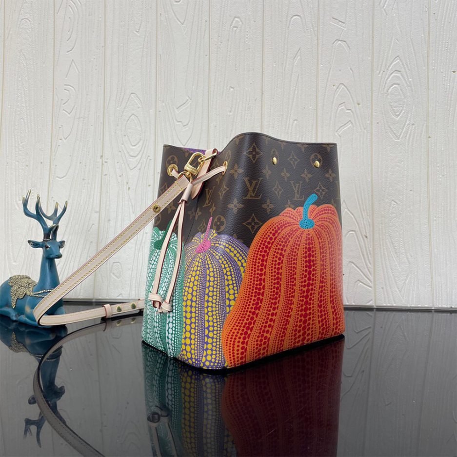 The LV x YK Neonoe MM is a limited-edition collaboration bucket bag that reimagines Louis Vuitton’s iconic Neonoe silhouette with the visionary art of Yayoi Kusama. Crafted from signature Monogram canvas adorned with Kusama’s iconic pumpkin motifs, it features natural cowhide leather trim, polished golden hardware, a detachable adjustable shoulder strap, and a drawstring closure for secure storage. Perfect for daily commutes, travel, and everyday essentials, it maintains a timeless, functional profile that embodies the fusion of iconic LV craftsmanship and contemporary art, making it a highly collectible luxury piece.