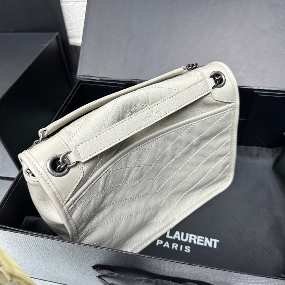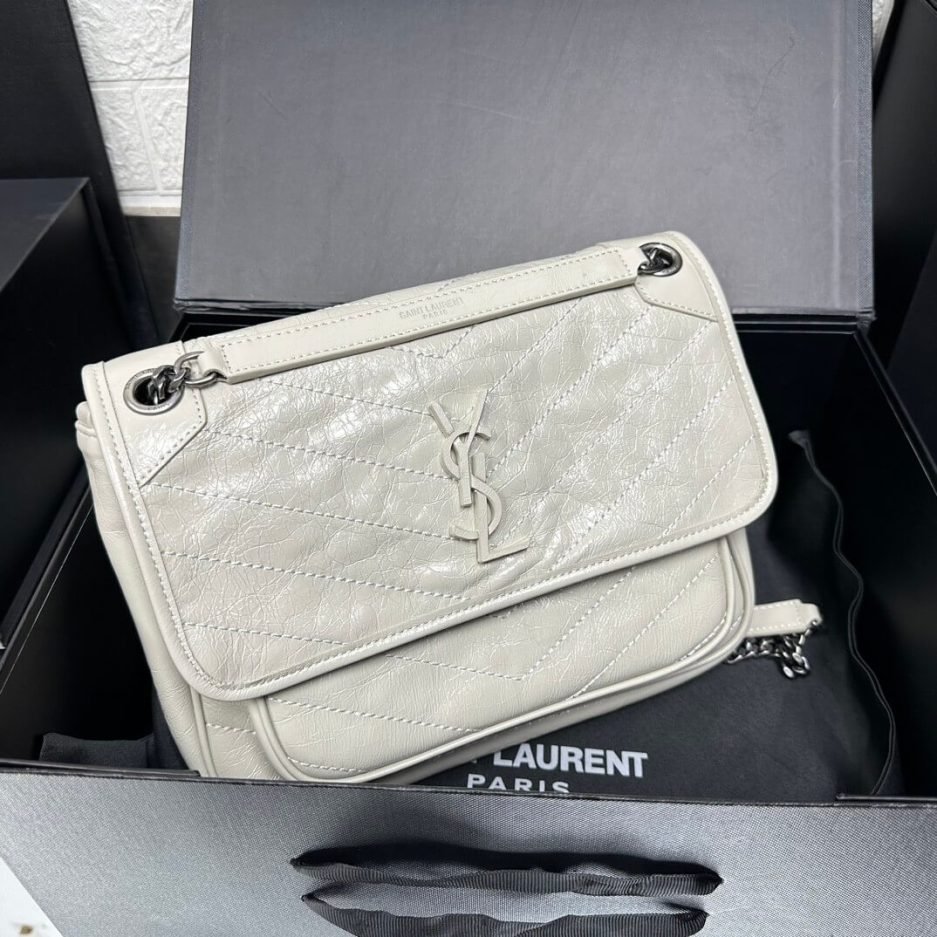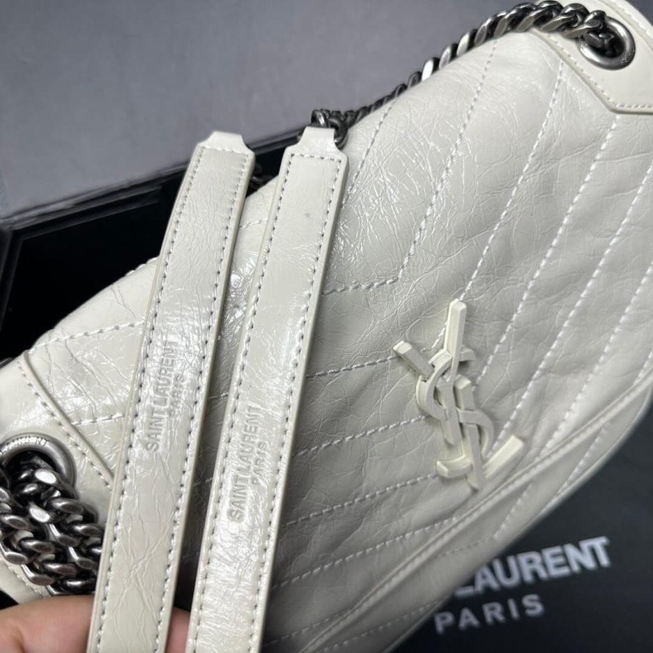 This Saint Laurent NIKI MEDIUM shoulder bag is an iconic piece from the brand, crafted from soft off-white vintage distressed leather. Featuring signature V-shaped quilting, it balances casual ease with sophisticated style. Paired with a metal chain and leather strap, it can be worn on the shoulder or crossbody, and its medium capacity easily holds daily essentials—making it a versatile choice for both work and leisure.
