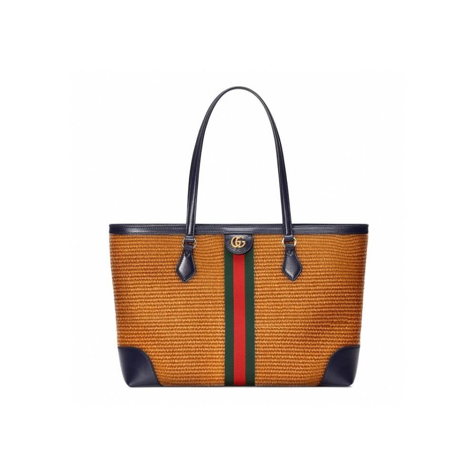The Ophidia GG medium tote is a luxurious, summery essential from Gucci’s iconic Ophidia collection, blending Italian craftsmanship with timeless design. Crafted from premium woven raffia with smooth black leather trim, this structured medium tote features the iconic Web stripe detail, a polished gold-tone double G logo plaque, sturdy dual top leather handles, and reinforced leather corner protectors for durability. Its generously sized interior offers ample space for a laptop, beach essentials, and daily necessities, making it perfect for work, travel, and sophisticated warm-weather outings.