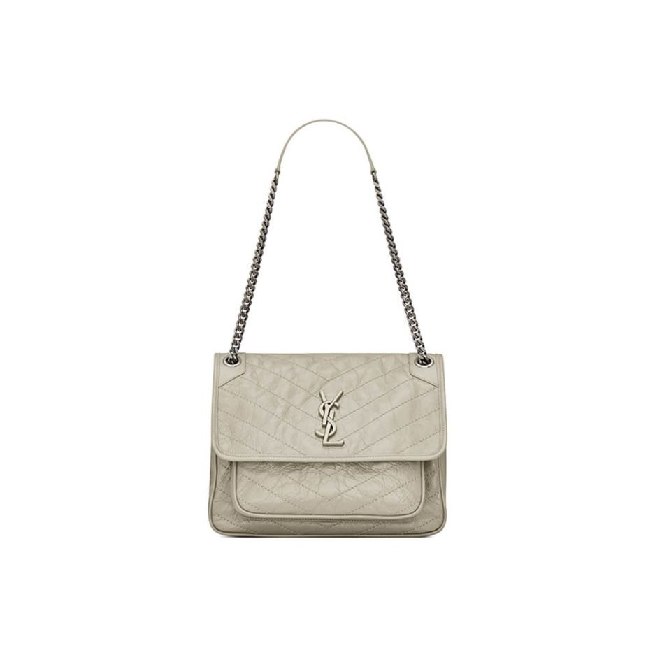 This Saint Laurent Niki Medium in Crinkled Vintage Leather is an iconic Saint Laurent piece, crafted from soft light grey crinkled vintage leather with signature V-shaped chevron quilting that defines its soft, relaxed silhouette. The front flap is adorned with a tone-on-tone YSL monogram, exuding a gentle, cool-toned luxury vibe. Equipped with a vintage silver-tone metal chain strap, it can be worn crossbody or over the shoulder—its spacious interior makes it ideal for daily commuting, and the crinkled leather carries a timeless, worn-in charm, a versatile essential that never goes out of style.