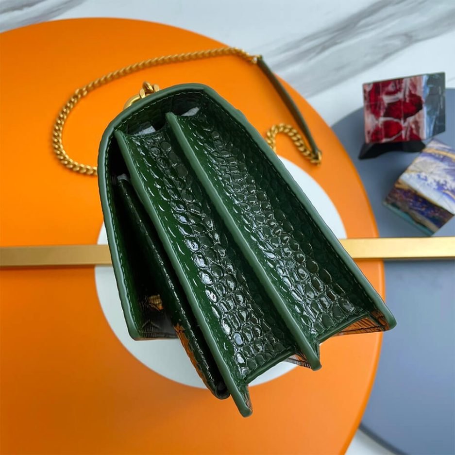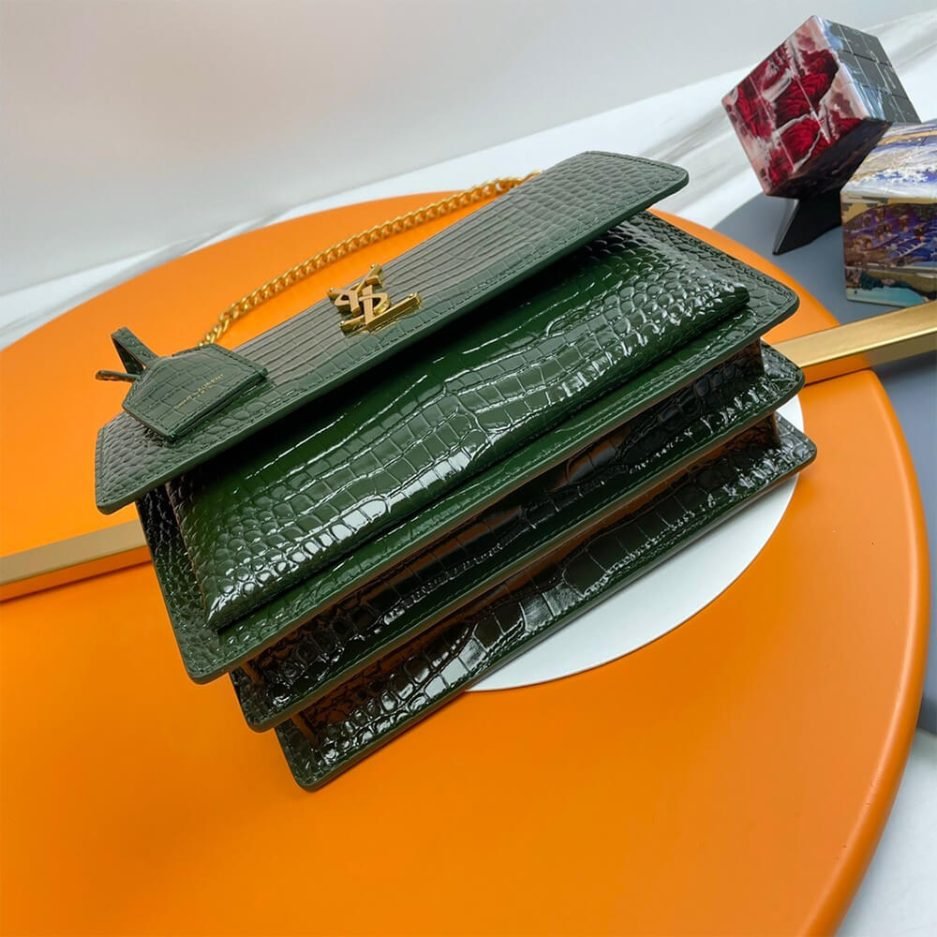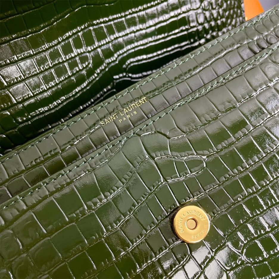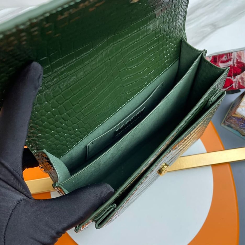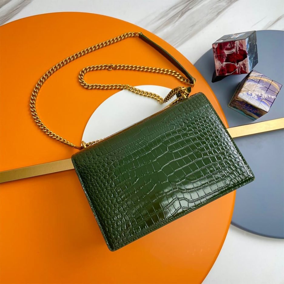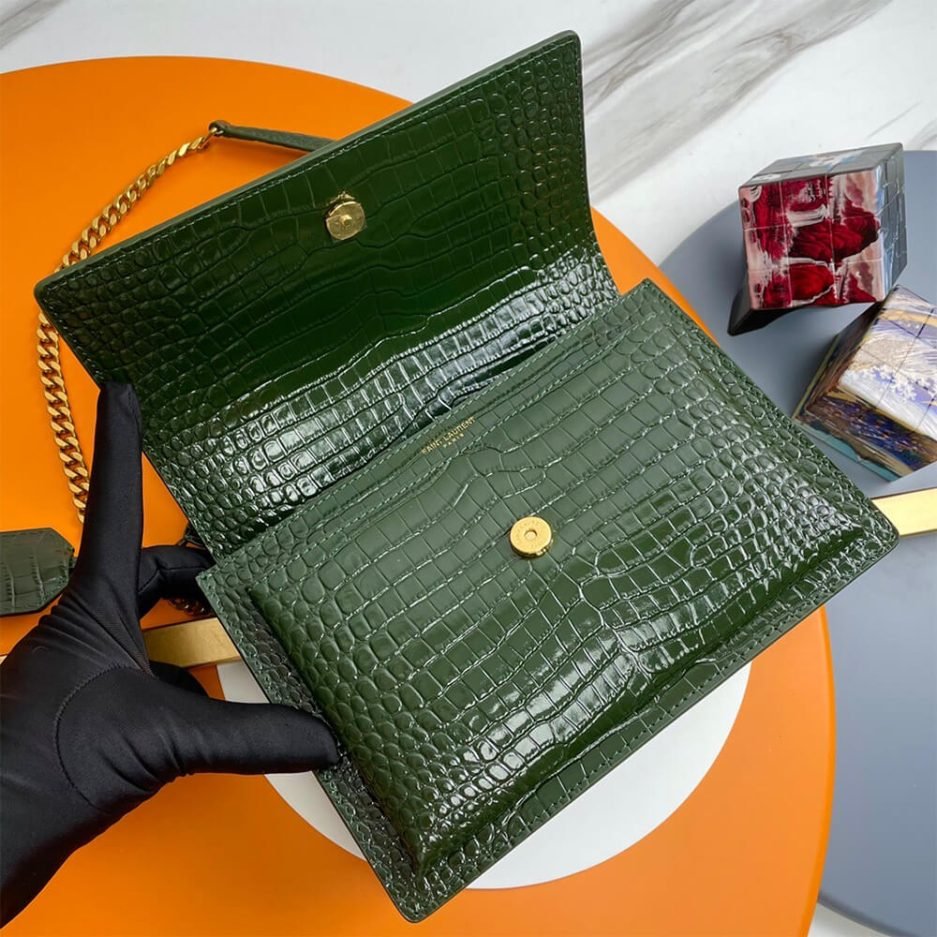 This Saint Laurent SUNSET Medium is a vintage and sophisticated piece from the brand, crafted from dark green crocodile-embossed leather. The three-dimensional texture creates a vintage vibe, and it is adorned with the signature YSL metal logo. It features a woven chain strap for crossbody or shoulder carry. The flap closure opens to a main compartment and slip pockets. With moderate capacity, it is perfect for storing essentials like a phone, cardholder and lipstick, making it a refined and atmospheric accessory for autumn/winter outfits and vintage styling.