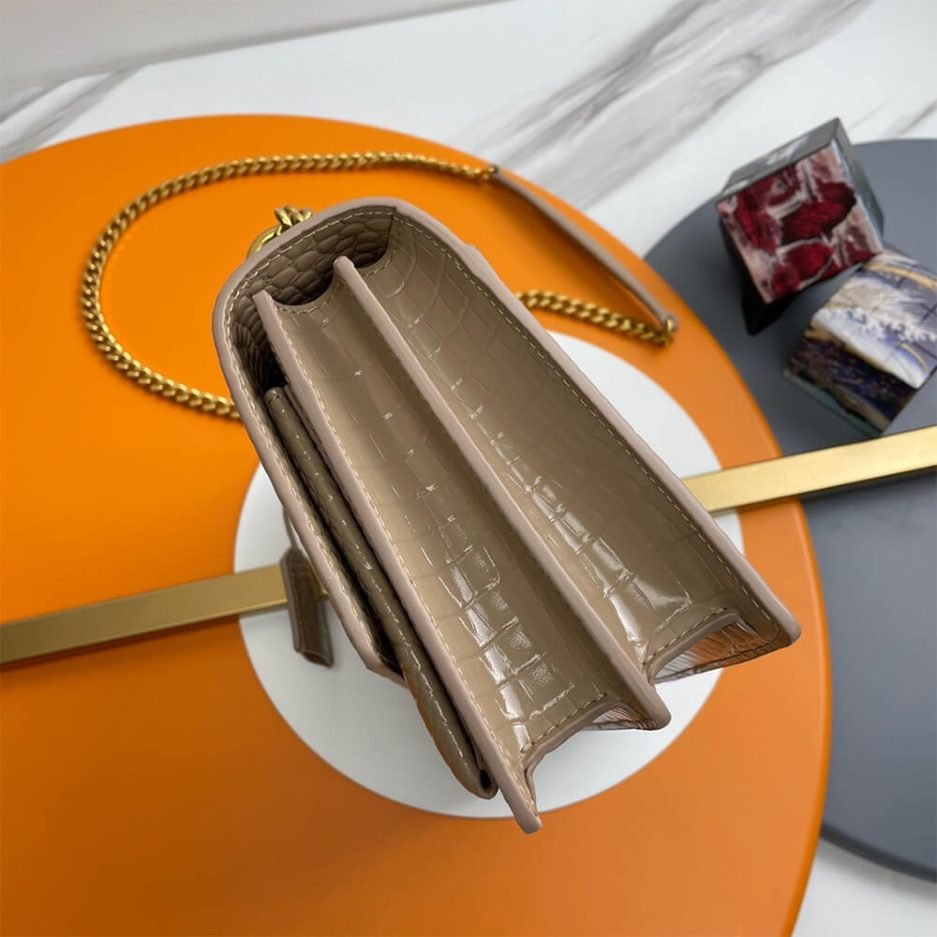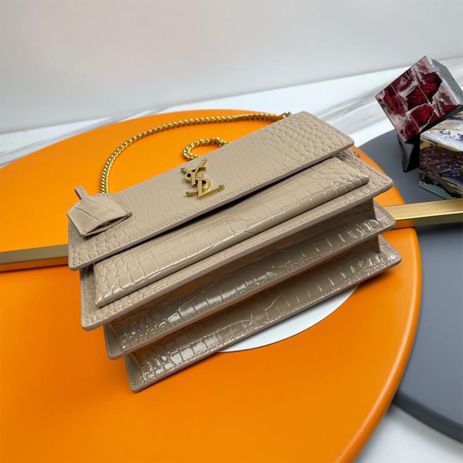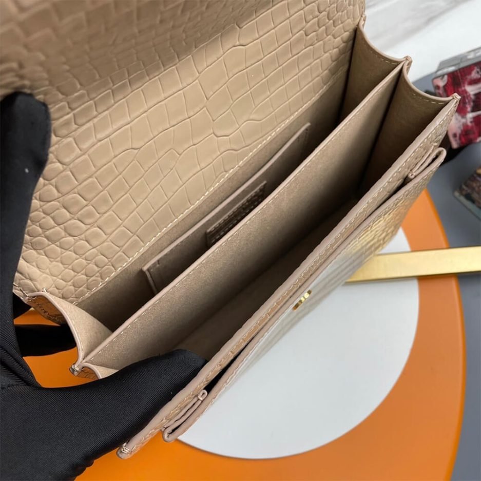 This Saint Laurent SUNSET Medium is a gentle, textured piece from the brand, crafted from light camel crocodile-embossed leather, adorned with the signature YSL metal logo. It features a woven chain strap for crossbody or shoulder carry. The flap closure opens to a main compartment and slip pockets. With moderate capacity, it is perfect for storing essentials like a phone, cardholder and lipstick, making it a soft refined accessory for daily commutes and casual social occasions.