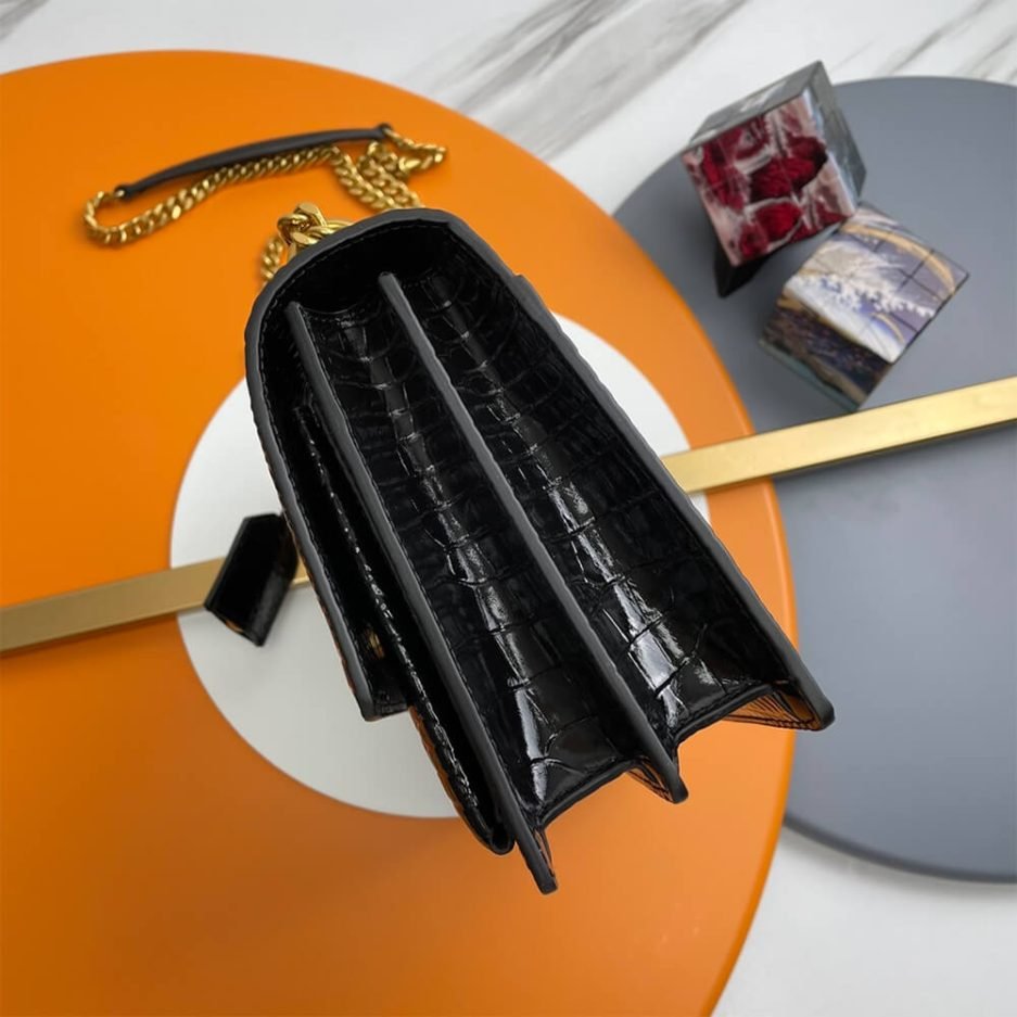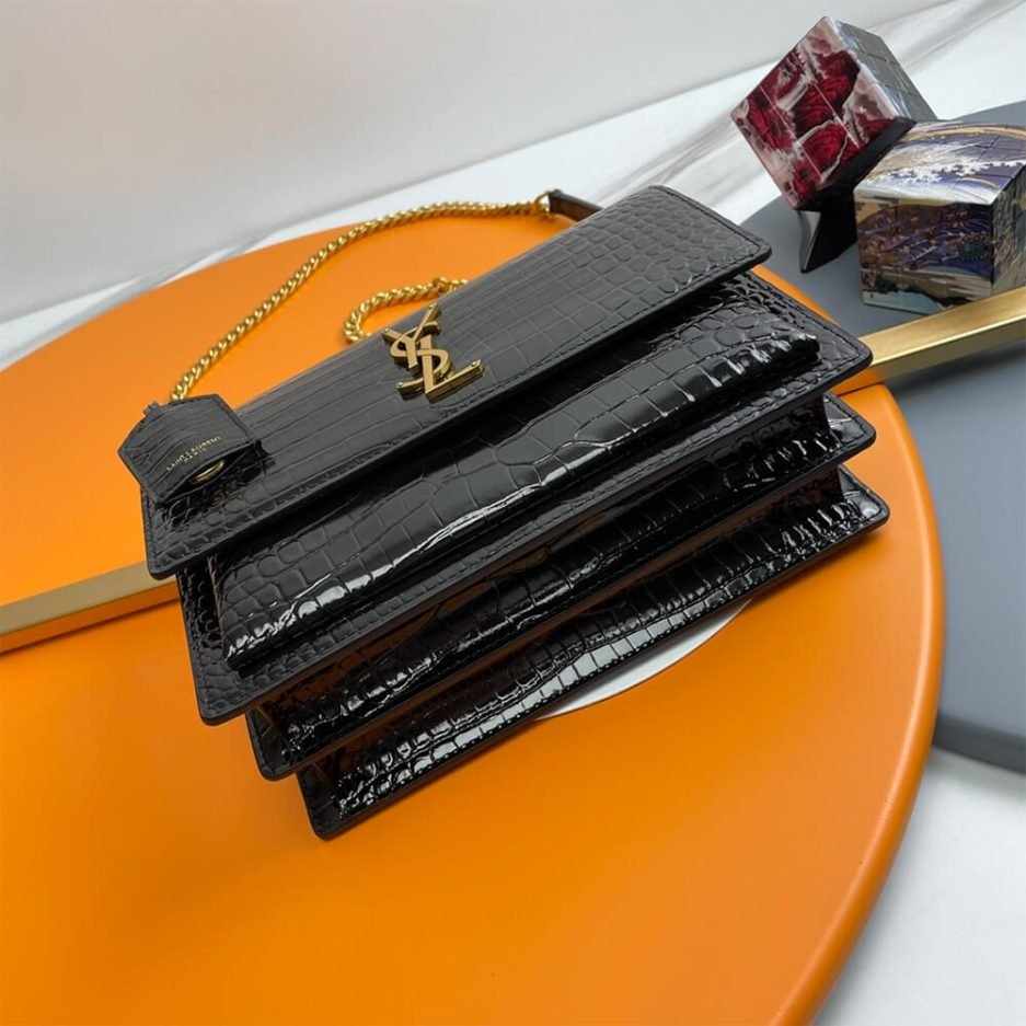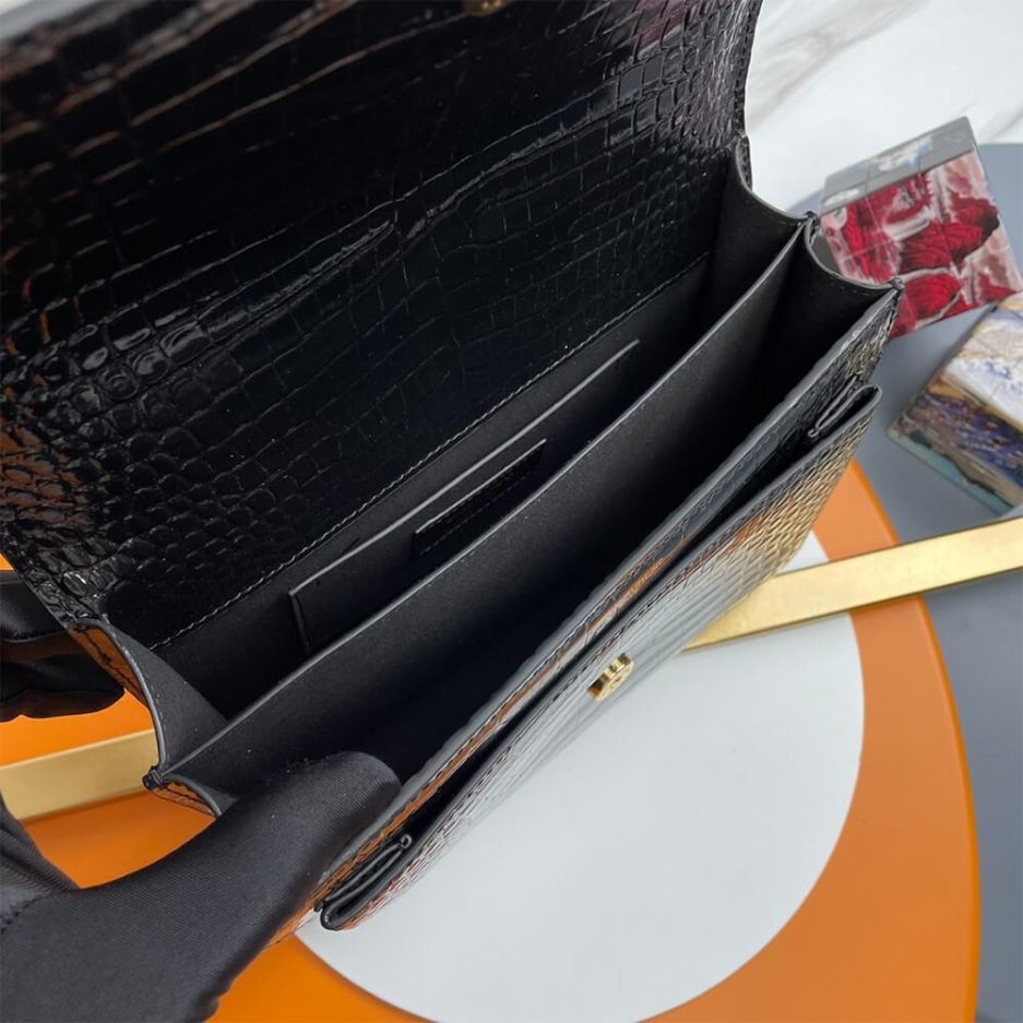 This Saint Laurent SUNSET Medium is a cool and classic piece from the brand, crafted from black crocodile-embossed leather with premium three-dimensional texture, adorned with the signature gold-tone YSL metal logo. It features a two-tone woven chain strap for crossbody or shoulder carry. With a flap magnetic closure, the bag opens to a main compartment and practical slip pockets. Moderate in capacity, it easily holds daily essentials like a phone, cardholder, and lipstick, making it a versatile and refined accessory for commutes, dates, and formal occasions.