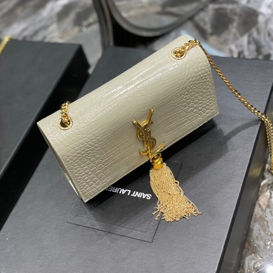 This Saint Laurent Kate shoulder bag is a gentle and fresh piece from the brand, crafted from off-white crocodile embossed leather. The three-dimensional texture exudes premium appeal, featuring a sleek and classic flap silhouette. The iconic gold-tone YSL logo and tassel charm on the front add a playful yet elegant touch. It comes with a detachable metal chain strap for versatile shoulder, crossbody, or clutch carry, perfect for dates, parties, and other occasions. The interior offers moderate capacity, easily holding daily essentials like a phone, cardholder, and lipstick. It is a soft and refined accessory for spring/summer styling and formal events.