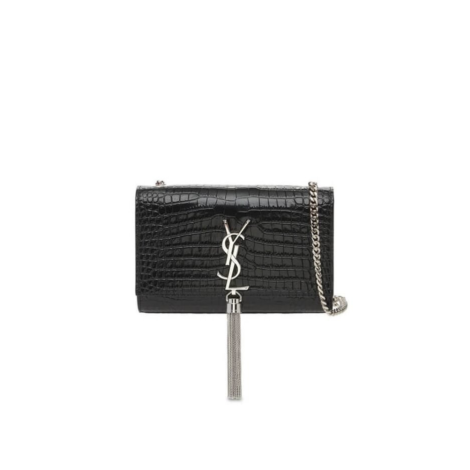 This Saint Laurent Kate shoulder bag is a classic and edgy piece from the brand, crafted from black crocodile embossed leather. The three-dimensional texture exudes premium matte appeal, featuring a sleek and classic flap silhouette. The iconic silver-tone YSL logo and tassel charm on the front elevate the design with a sophisticated black-gold-silver contrast. It comes with a detachable metal chain strap for versatile shoulder, crossbody, or clutch carry, perfect for commutes, dates, parties, and all occasions. The interior offers moderate capacity, easily holding daily essentials like a phone, cardholder, and lipstick. It is a versatile and refined accessory for work, formal events, and daily outings.