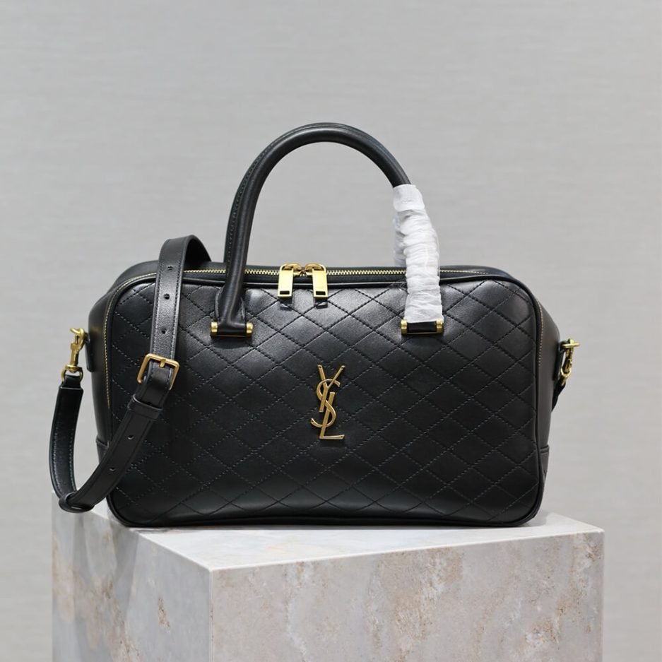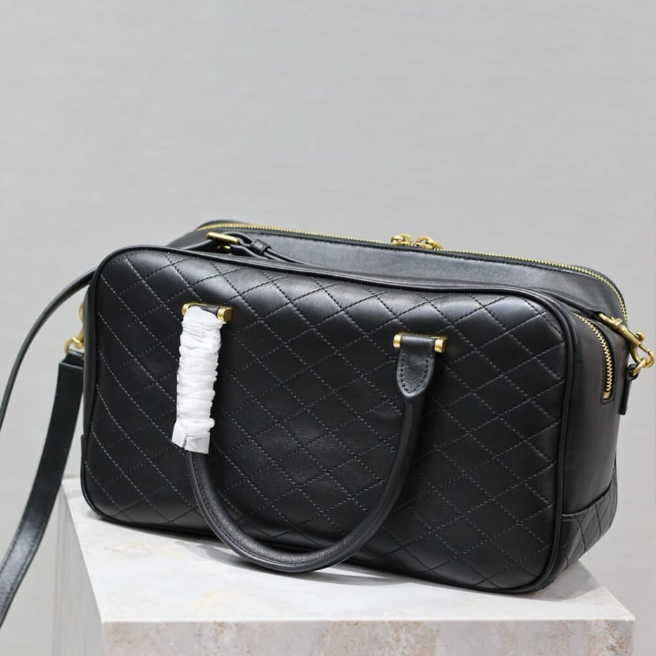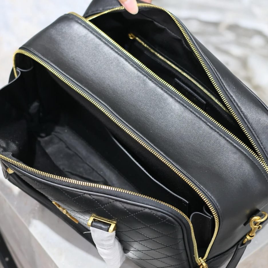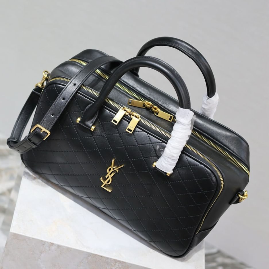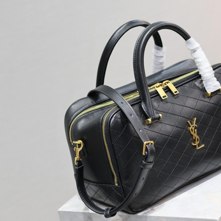 The YSL LIYA DUFFLE BAG is a bold expression of modern luxury, designed for both travel and everyday sophistication. Crafted with iconic quilted leather, this structured duffle features a polished gold-tone YSL monogram at the front, paired with sturdy top handles for comfortable carry. The spacious main compartment offers ample room for weekend essentials, work gear, or travel necessities, while the secure zip-top closure keeps your belongings protected. Its timeless silhouette and premium craftsmanship make it a versatile statement piece that transitions seamlessly from casual outings to formal occasions.