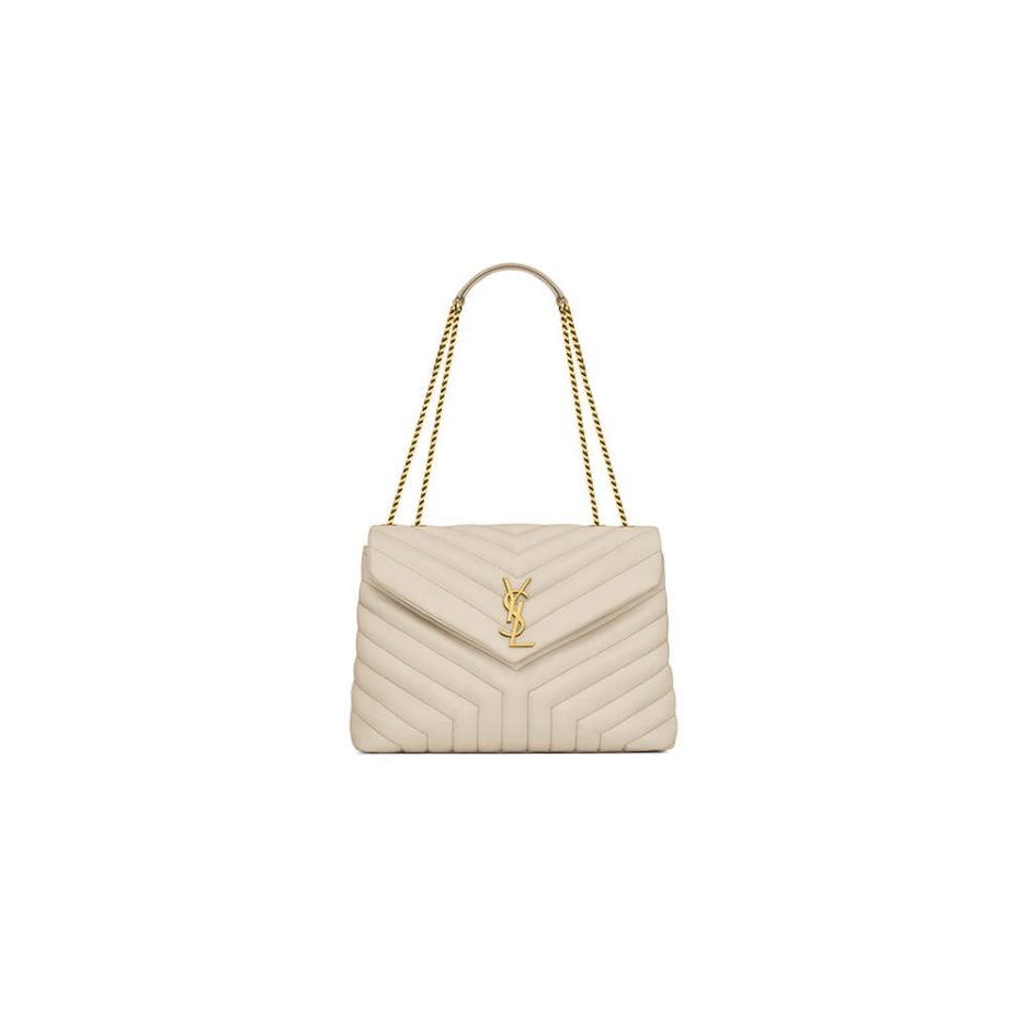 This YSL Loulou Medium Shoulder Bag is an iconic Saint Laurent piece, crafted from soft light beige smooth leather with signature V-shaped chevron quilting that defines its structured, plush silhouette. The front flap is adorned with a gold-tone YSL monogram, exuding gentle, elegant luxury. Equipped with a double gold-tone metal chain strap and leather shoulder pad, it can be worn on the shoulder or crossbody—its moderate capacity efficiently holds daily commuting essentials, a timeless and versatile essential.