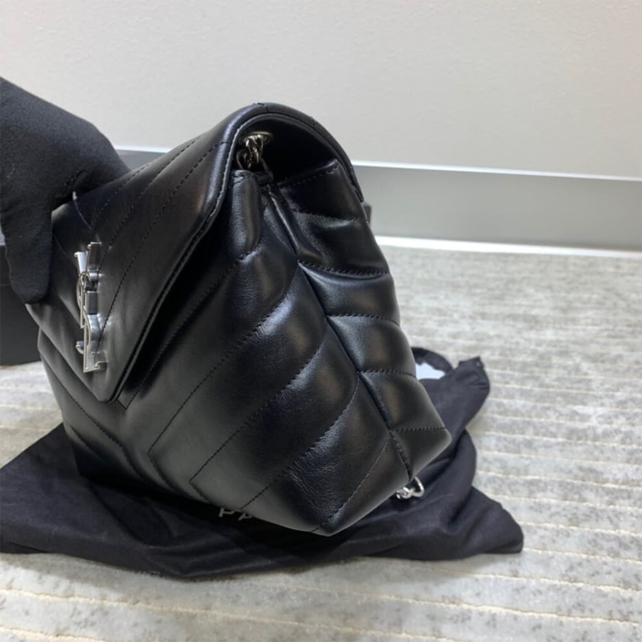This YSL Loulou Small Chain Bag is an iconic Saint Laurent piece, crafted from classic black smooth leather with signature V-shaped chevron quilting that defines its sleek, structured silhouette. The front flap is adorned with a silver-tone YSL monogram, exuding understated, edgy luxury. Equipped with a detachable metal chain strap and leather shoulder pad, it can be worn crossbody or over the shoulder—its compact size efficiently holds daily essentials while elevating any outfit, a timeless and versatile essential.