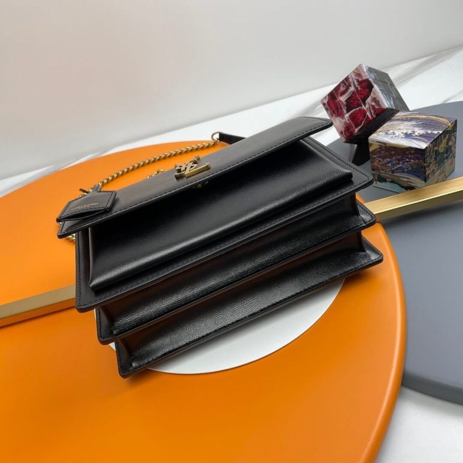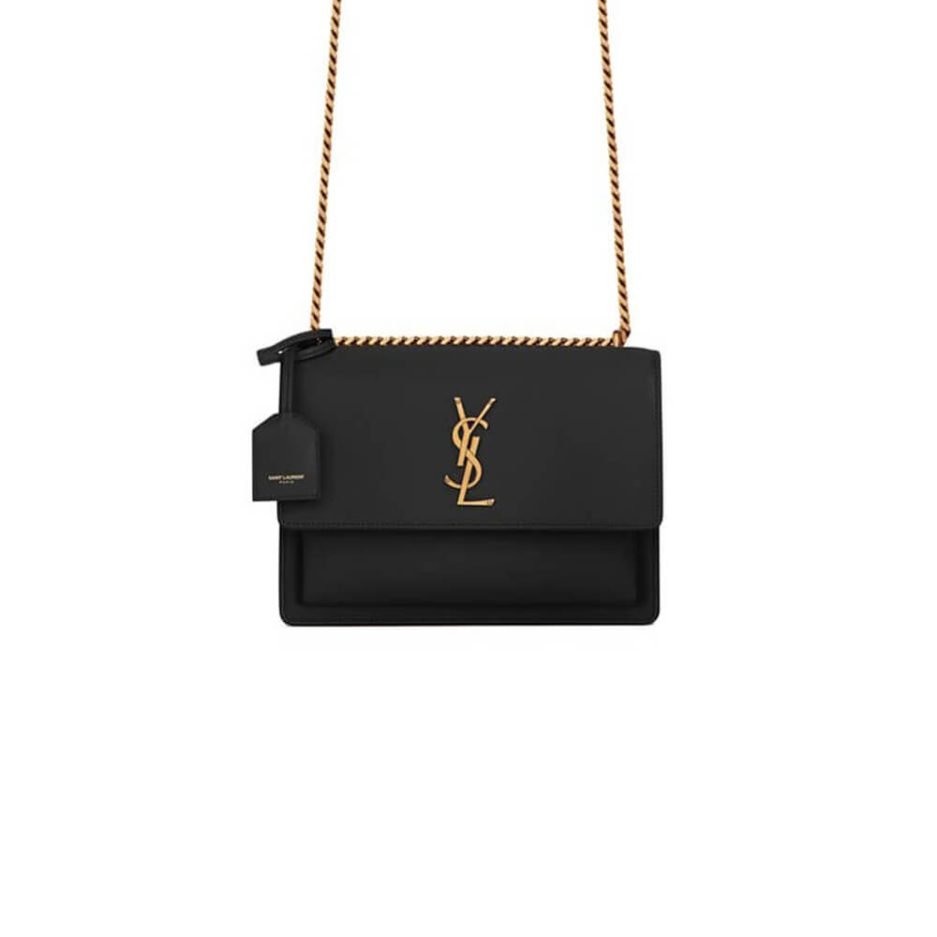 This Saint Laurent SUNSET Medium is a cool and classic piece from the brand, crafted from black smooth leather with a glossy finish that exudes sophistication, adorned with the signature gold-tone YSL metal logo. It features a two-tone woven metal chain strap for crossbody or shoulder carry. With a flap magnetic closure, the bag opens to a main compartment and practical slip pockets. Moderate in capacity, it easily holds daily essentials like a phone, cardholder, and lipstick, making it a versatile and refined accessory for commutes, dates, and formal occasions.