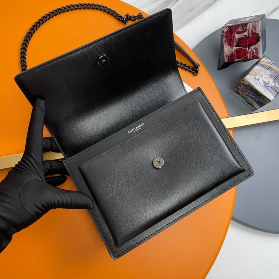 This Saint Laurent SUNSET Medium is a cool and minimalist piece from the brand, crafted from all-black matte leather. The matte finish offers understated sophistication, adorned with a tone-on-tone embossed YSL logo. It features a black woven chain strap for crossbody or shoulder carry. With a flap magnetic closure, the bag opens to a main compartment and practical slip pockets. Moderate in capacity, it easily holds daily essentials like a phone, cardholder, and keys, making it an edgy accessory for cool commutes, street styling, and dark-toned looks.